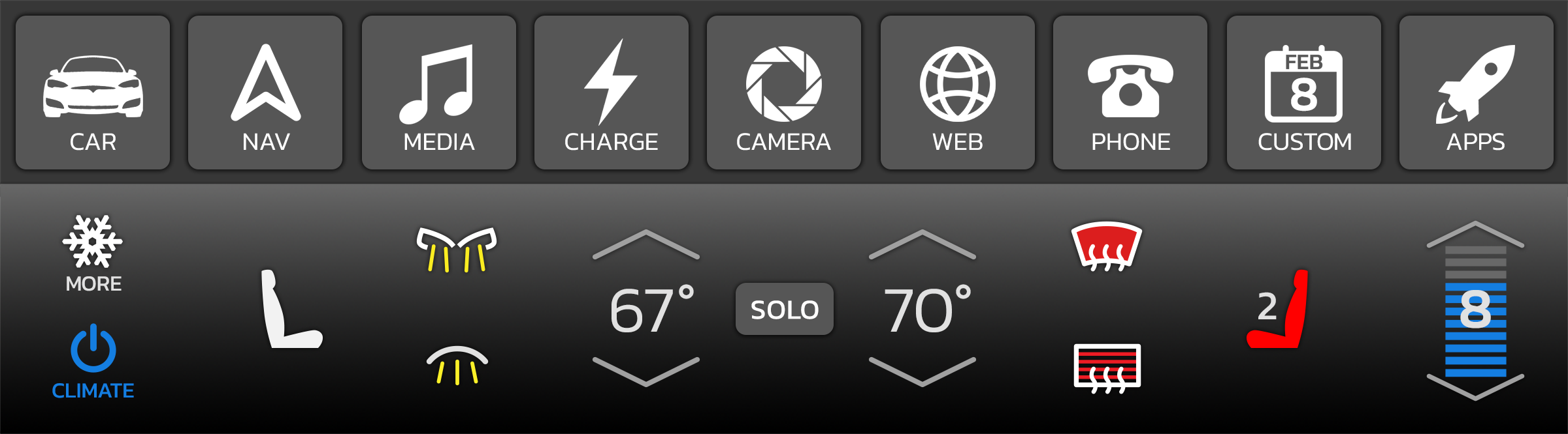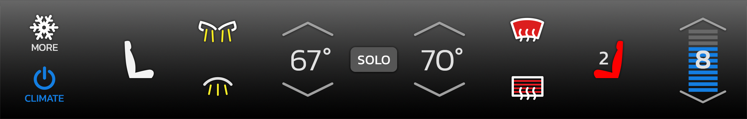 Finding the rest of the climate controls was never easy. I set out to fix that. So now when you tap the MORE snowflake, a single panel slides up with ALL the remaining climate controls visible....
