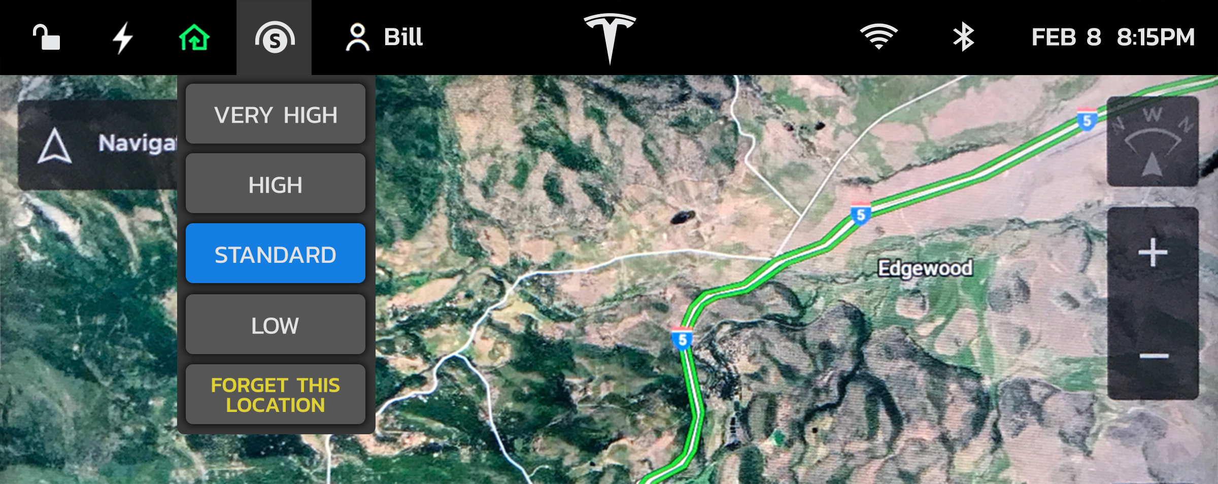 I thought it would be great to always see what the ride height is, so I designed a new Suspension icon and quick menu. With this added icon we can now, at a glance, see the ride height setting, marked with a V, H, S, or L, and with a single tap, change it, or easily remove the current remembered location. Tapping "Forget This Location" will remove the last location change and restore ride height to what it was before the change. This menu can also auto-present itself when a past location changes ride height.